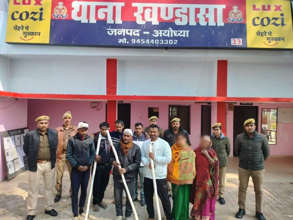 अयोध्या। खण्डासा थाना क्षेत्र के कीन्हूपुर पूरे पाण्डेय गांव में पुरानी रंजिश को लेकर दो पक्षों के बीच हुई मारपीट में आधा दर्जन लोग घायल हुए थे। गंभीर रूप से घायल हुए युवक संदीप कुमार की इलाज के दौरान मेडिकल कॉलेज में मौत हो गई थी। शव पोस्टमार्टम होने के बाद गांव पहुंचा तो ग्रामीणों में आक्रोश व्याप्त गया था। लेकिन पुलिस ने मृतक के भाई ओम प्रकाश की तहरीर के आधार पर एक दर्जन लोगों के खिलाफ गंभीर धाराओं में मुकदमा दर्ज कर तलाश में जुटी हुई थी। मुखबिर ने पुलिस को सूचना दिया कि कीन्हूपुर गांव में मारपीट करने वाले कुछ आरोपी खण्डासा बाजार से अमानीगंज ब्लाक जाने वाले मार्ग पर खड़े हैं और कहीं जाने के लिए वाहन का इंतजार कर रहे हैं। जानकारी मिलते ही थानाध्यक्ष मनोज यादव, उपनिरीक्षक विनय कुमार, शैलेश कुमार त्रिवेदी, राहुल कुमार यादव कांस्टेबल स्वर्णकमल कुशवाहा, मुनीष कुमार, पंकज कुमार, दुर्गा प्रसाद यादव महिला कांस्टेबल सोनम यादव व पूजा यादव ने मौके पर पहुंचकर घेराबंदी करते हुए दो महिलाओं समेत 8 लोगों को गिरफ्तार कर लिया। गिरफ्तार किए गए लोगों के निशान देही पर पुलिस टीम ने मारपीट में प्रयुक्त लाठी डंडों को भी बरामद कर लिया है। थानाध्यक्ष मनोज कुमार यादव ने बताया कि मारपीट में शामिल अभियुक्त मनोज कुमार, विदेशी राम पुत्र छंगू , दीपक, नीरज पुत्र विदेशी निवासी कीन्हूपुर, राजेश कुमार पुत्र मंगरू, अमरजीत पुत्र राधेश्याम निवासी कुर्मी का पुरवा समेत दो महिलाओं को गिरफ्तार कर विधिक कार्रवाई करने के बाद न्यायालय प्रस्तुत किया गया जहां से उन्हें जेल भेज दिया गया। सभी आरोपियों के खिलाफ 147,148, 323, 452, 504, 506, 307, 308, 302, 34 की धारा में मुकदमा पंजीकृत है फरार चल रहे अन्य आरोपियों की तलाश के लिए भी पुलिस टीम में लगाई गई है जल्द गिरफ्तार कर उन्हें भी न्यायालय में पेश किया जाएगा।