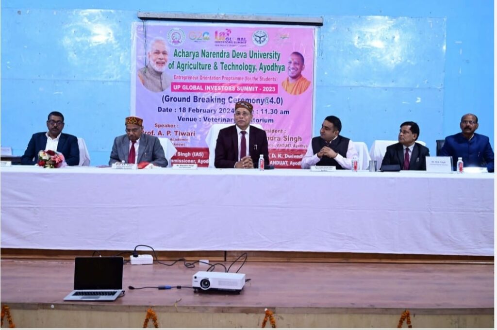 अयोध्या।आचार्य नरेंद्र देव कृषि एवं प्रौद्योगिक विश्वविद्यालय में पशुपालन महाविद्यालय के प्रेक्षागृह में उद्यम उन्मुखीक कार्यक्रम का आयोजन किया गया। कार्यक्रम की अध्यक्षता विश्वविद्यालय के कुलपति डा. बिजेंद्र सिंह ने की। कायप का शुभारंभ कृषि विवि के कुलपति डा. बिजेंद्र सिंह व अन्य अतिथियों ने जल भरो कार्यक्रम के साथ किया। मौके पर कार्यक्रम की अध्यक्षता कर रहे कुलपति ने प्रदेश की अर्थव्वयस्था को T वन ट्रिलियन डालर तक पहुंचाने लिए युवाओं को प्रेरित किया। नगर आयुक्त विशाल सिंह ने अयोध्या के अंदर 2047 तक होने वाले विकास परियोजना की पृष्ठभूमि को प्रजेंटेशन के माध्यम से सभी के सामने रखा। उन्होंने छात्र-छात्राओं को बताया कि परियोजानाओं का कार्यान्वयन आठ परिकल्पनाओं के आधार पर किया जा रहा है जिससे अयोध्या में विकास की रफ्तार तेजी के साथ जोर पकड़ेगी। इसमें सांस्कृतिक अयोध्या, आयुष्मान अयोध्या, भावनात्मक, सुरम्य, सुगम्य, आधुनिक एवं सक्षम अयोध्या को शामिल किया गया है। नगर आयुक्त ने बताया कि 2047 तक हमारे अयोध्या की तस्वीर पूरी तरह से बदली-बदली नजर आएगी।