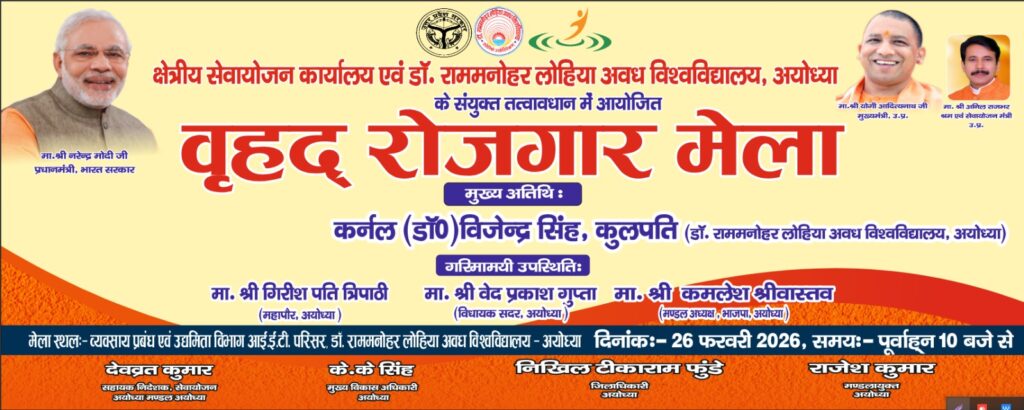 अयोध्या। सहायक निदेशक सेवायोजन श्री देवव्रत कुमार ने बताया कि क्षेत्रीय सेवायोजन कार्यालय एवं डॉ० राममनोहर लोहिया अवध विश्वविद्यालय के संयुक्त तत्वावधान में दिनांक 26 फरवरी 2026 को व्यवसाय प्रबंधन एवं उद्यमिता विभाग, आई०ई०टी० परिसर अयोध्या में एक द्विवसीय वृहद रोजगार मेले का आयोजन किया जा रहा है। इस रोजगार मेले में देश के कोने-कोने से 50 से अधिक प्रतिष्ठित कम्पनियां जैसे एक्सिस बैंक, एच०डी०एफ०सी० बैंक, टाटा मोटर्स, एम०आर०एफ०टायर्स, एल०एण्डटी० श्रीराम पिस्टन एण्ड रिंग्स प्रयान ग्लोबल, वैष्णवी इन्टीग्रेटेड, फर्स्ट मैरेडियन वर्धमान टेक्सइाइल्स, मेधावी एस्पायर, आर०एस०वी० ज्वाइन इण्डिया, सुजलान, कपारो मारूति, अमास स्किल बेन्चरस, यजाकी इण्डिया, टाटा इलेक्ट्रानिक्स (महिलाओं के लिए) न्यू ट्रैक्टर हॉलैण्ड, यमाहा इण्डिया लि० इत्यादि द्वारा 5000 से अधिक पदों पर चयन की कार्यवाही की जायेगी। रोजगार मेले में ऐसे पुरुष तथा महिला बेरोजगार अभ्यर्थी जिनकी आयु 18 से 45 वर्ष के मध्य है एवं शैक्षणिक योग्यता कक्षा-8, हाईस्कूल, इण्टरमीडिएट, स्नातक, परास्नातक, आई०टी०आई०, डिप्लोमा, बी०बी०ए०, एम०बी०ए०, बीटेक, वी०फार्मा, डी०फार्मा, फार्मेसी तक प्रतिभाग कर सकते है। मेले में माननीय अतिथियों के रूप में कुलपति महोदय, सदर विधायक महोदय, महापौर महोदय तथा अन्य गणमान्य अतिथि गण उपस्थित रहेगें। ऐसे अभ्यर्थी rojgaarsangam.up.gov.in (रोजगार मेला आई०डी०- 10376 एवं ncs.gov.in पोर्टल पर पंजीकरण कराकर प्रतिभाग कर सकते है। रोजगार मेले में प्रतिभाग करने हेतु अभ्यर्थी अपने शैक्षणिक प्रमाण-पत्रों की छायाप्रति, पहचान पत्र एवं बायोडाटा के साथ उक्त दिनांक को व्यवसाय प्रबंधन एवं उद्यमिता विभाग, आई०ई०टी० परिसर डॉ० राम मनोहर लोहिया अवध विश्वविद्यालय अयोध्या में उपस्थित हो। इस हेतु किसी भी प्रकार का मार्ग व्यय आदि देय नहीं है।