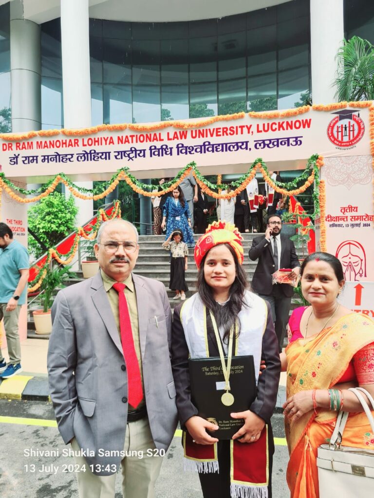 डॉ राम मनोहर लोहिया राष्ट्रीय विधि विश्वविद्यालय लखनऊ में साइबर लॉ डिप्लोमा की पढ़ाई करने वाले चाचा–भतीजी ने नाम रोशन कर दिया।आपको बता दे की अयोध्या जनपद के तहसील मिल्कीपुर अंतर्गत कुमारगंज निवासी रामचंद्र शुक्ला के पुत्र राजेश चंद्र शुक्ला तथा उनकी पौत्री शिवानी शुक्ला ने साइबर लॉ डिप्लोमा में स्वर्ण पदक तथा रजत पदक हासिल किया। इस महान उपलब्धि से नगर पंचायत कुमारगंज वासियों में खुशी का माहौल बना हुआ है।