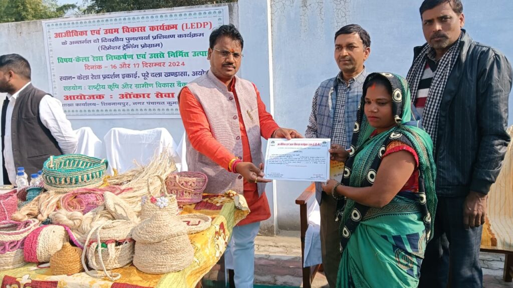 अयोध्या जनपद के अमानीगंज विकास खंड में नाबार्ड के सहयोग से ओंकार सेवा संस्थान द्वारा स्थापित केला प्रदर्शन इकाई पर आयोजित दो दिवसीय प्रशिक्षण कार्यक्रम का समापन आज क्षेत्र के समाजसेवी चंद्र भानू पासवान के द्वारा किया गया । चंद्र भानू जी ने समापन सत्र को संबोधित करते हुए कहा कि केला का रेशा आज महिलाओं के लिए रोजी रोटी का माध्यम बन रहा हैं , हिन्दू धर्म में लोग केला के पौधे की पूजा करते है तथा हिन्दुओं का कोई भी मांगलिक कार्यक्रम बिना केला के पौधे के संपन्न नहीं होता है ऐसे में केला हमारे लिए आर्थिक और आध्यात्मिक उन्नति का मार्ग बन गया है । पासवान जी ने महिलाओं द्वारा निर्मित उत्पादों की बिक्री ने हर संभव मदद का भरोसा दिया । विदित हो कि चंद्र भानू पासवान का गुजरात में उद्योग है ऐसे में उनके द्वारा महिलाओं को भरोसा दिया जाना एक शुभ संकेत है । कार्यक्रम को संबोधित करते हुए कार्यक्रम समन्वयक सूर्य कुमार त्रिपाठी ने कहा कि शीघ्र ही हम लोगों को अयोध्या में एक दुकान मिल रही है जिससे महिलाओं की आमदनी में इजाफा होगा ।