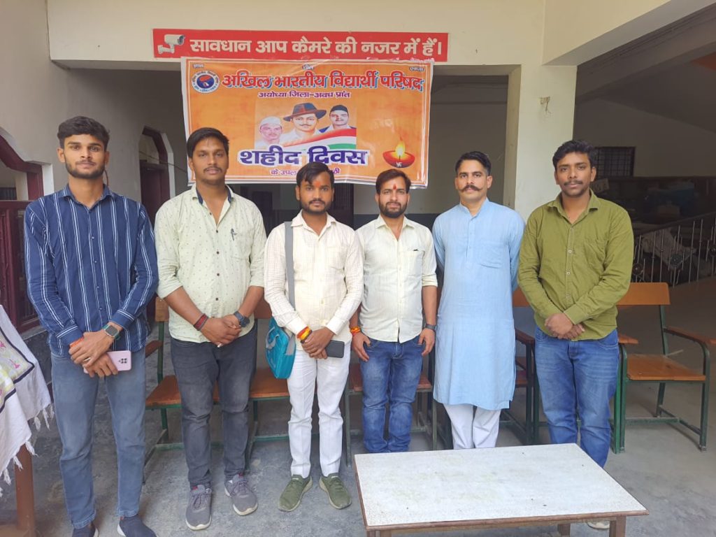 अखिल भारतीय विद्यार्थी परिषद अयोध्या जिला द्वारा आज शहीद दिवस के शुभ अवसर पर जिले के विभिन्न इकाई कुमारगंज, मिल्कीपुर ,मवई ,शुजागंज, चमनगंज, रुदौलीआदि इकाइयों में शहीद दिवस पर संगोष्ठी दीप प्रज्वलन, निबंध प्रतियोगिता जैसे कार्यक्रमों का विद्यार्थी परिषद द्वारा आयोजन किया गया ।। शहीद दिवस के अवसर पर नमन करते हुए जिला संयोजक कुलदीप गुप्ता ने कहा की भगत सिंह ,राजगुरु, सुखदेव को , इतनी छोटी सी उम्र में देश के लिए अपने जान की खुशी खुशी फंदे पर लटक के इंकलाब ज़िंदाबाद के नारे लगा कर देश को एक नए संदेश देने का कार्य किए हैं। जिसमें जिला संगठन मंत्री पुष्पेंद्र बाजपाई, जिला प्रमुख डा रमेश मिश्रा , राष्ट्रीय कार्यकारिणी सदस्य ऋषभ गुप्ता,जिला संयोजक कुलदीप गुप्ता , कुमारगंज विस्तारक आदिश पाण्डेय,मिल्कीपुर के नगर अध्यक्ष अमित मिश्रा , संजीव अग्रहरि, विराट सिंह, आदित्य, हर्षित, अनूप मिश्रा, सभी नगर के नगर अध्यक्ष वा नगर मंत्री आदि कार्येकर्ता उपस्थित रहे।।